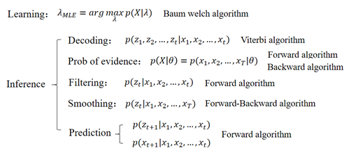 在Inference问题下又细分出了五类问题,分别是Decoding、Prob of evidence、Filtering、Smoothing和Prediction问题。其中Prob of evidence即是HMM中介绍的Evaluation问题。