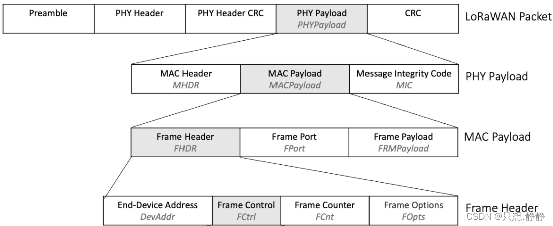 一文中分析了,这里的框图以LoRa调制做为PHY层来刨析MAC帧格式的组成- MAC数据帧封装在PHY层的PHY Payload字段中