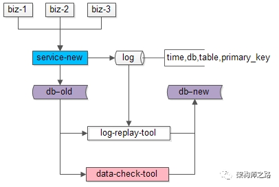 :在持续重放日志,追平数据的过程中,研发一个数据校验的小工具,将旧库和新库中的数据进行比对,直到数据完全一致。