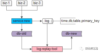 :服务进行升级,记录“对旧库上的数据修改”的日志(这里的修改,为数据的insert, delete, update),这个日志不需要记录详细数据,主要记录: