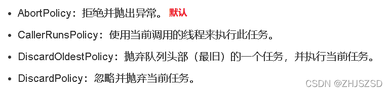 如果使用的是有界队列比如ArrayBlockingQueue(底层是链表),任务首先会被添加到ArrayBlockingQueue中,ArrayBlockingQueue满了,会根据maximumPoolSize的值增加线程数量,如果增加了线程数量还是处理不过来,ArrayBlockingQueue继续满,那么则会使用拒绝策略RejectedExecutionHandler处理满了的任务,默认是AbortPolicy。