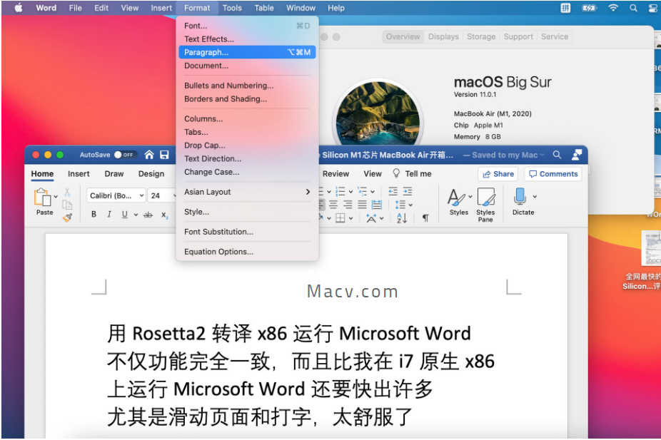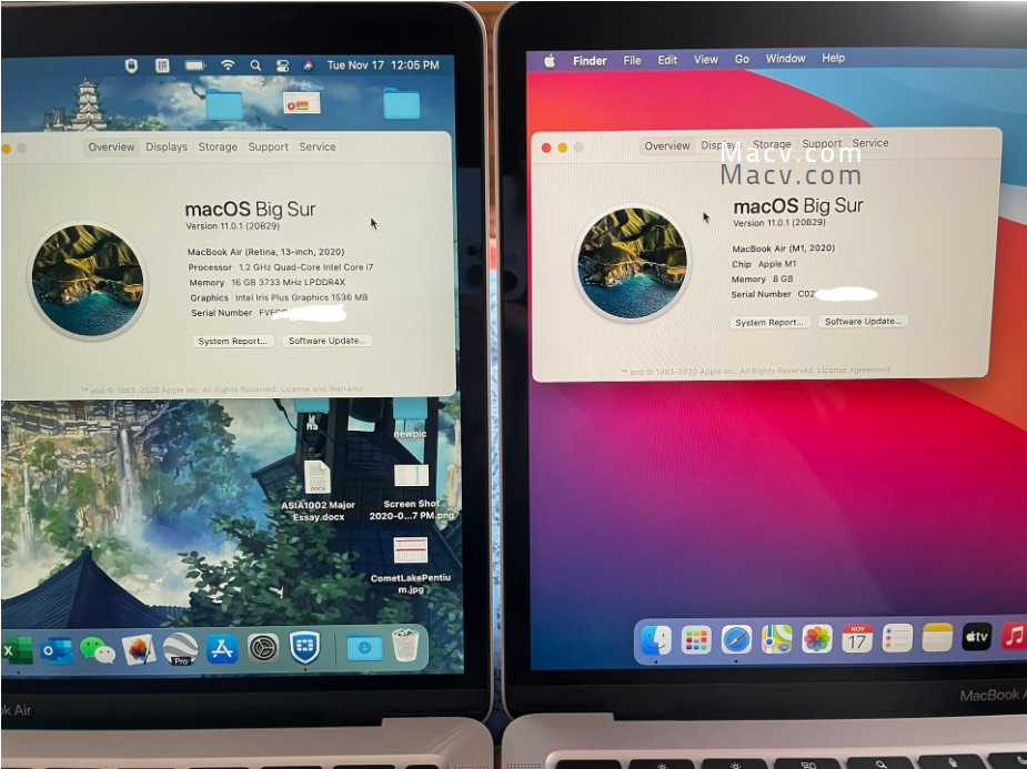 在均搭载macOS Big Sur 11.0.1 正式版(20B29)的情况下,M1芯片的Air在各项系统操作中流畅度远远超过Intel Air。尤其体现在动画效果、打开/切换应用程序、滑动、页面放大缩小、打字流畅度、和睡眠唤醒速度。