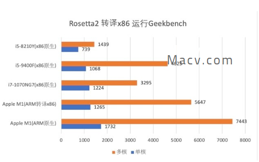 观体验后我们将用数据说话,测试CPU、GPU的各项性能。因为还有许多软件并未完全适配M1,而是使用Rosetta模拟器进行运作,所以在图中会特别标注。