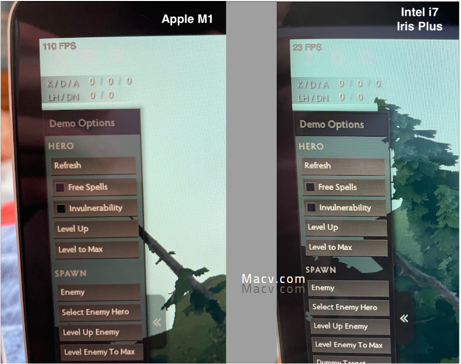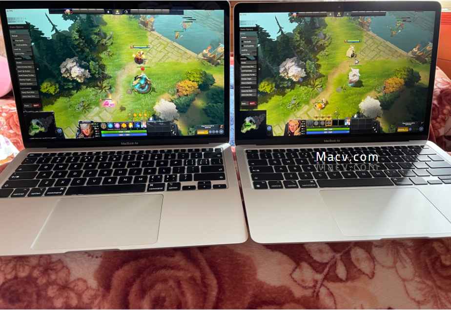 不测不知道,一测吓一跳。可以看到M1尽管是用Rosetta2模拟运行的x86 Dota2,但这帧数,整整领先Intel Iris三倍之多。加上Intel发热严重高于M1,风扇非常吵闹。实际感受就是Intel卡成了ppt,简直没法继续游戏,而M1是能很流畅,注意,是很流畅的运行这款游戏。(游戏帧率稳定性和持续性能测试在后面)