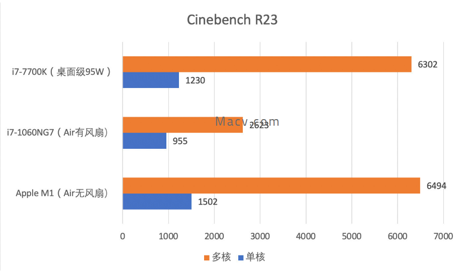 Cinebench 10分钟测试里,M1 Air无风扇的表现明显不如Pro M1和mini M1的7500分来的高,很明显无风扇导致的发热降频得背大锅。但是,1500分单核和6500分多核,依旧甩开了 i7 Air有风扇一大截距离。