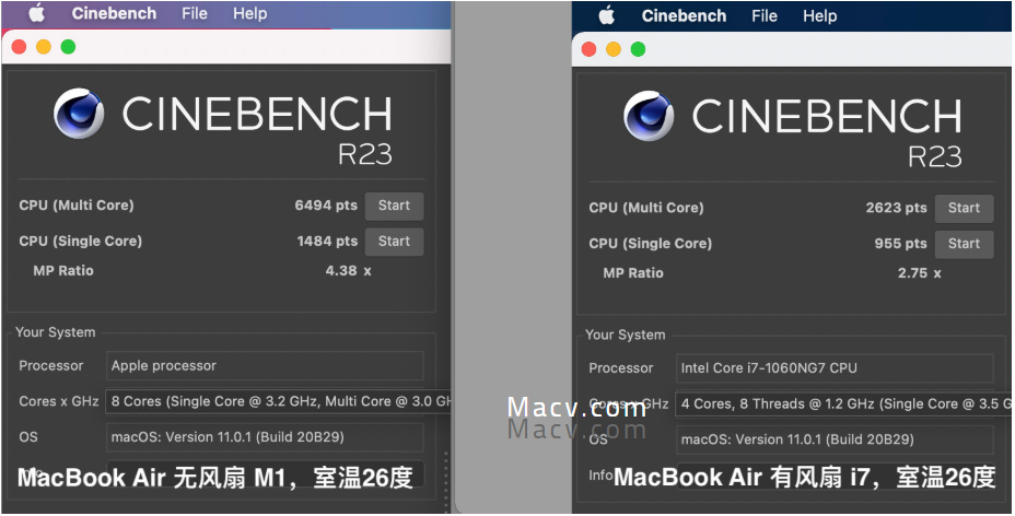 Intel x86有一个最大的问题就是高能耗。X86 CISC相对落后的架构和工艺,带来了超高发热量和功耗,让MacBook系列总是背负着发热大、降频、卡顿的包袱,俗称3秒真男人。当然不只是MacBook,许多Windows轻薄本也同样存在这个问题。那么这次测试以无风扇的被动散热M1 MacBook Air 和 有一个小风扇散热的 Intel MacBook Air进行对比,看看他们的持续性能表现究竟如何。