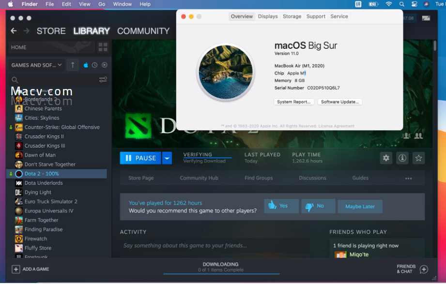说白了,Intel因为降频发热,实际性能并没有Geekbench峰值跑出来那样高。而M1的低发热使其持续性能输出更好,更符合Geekbench跑出来的峰值性能。这点我们从Dota2的10分钟测试便可以看到,Intel款尽管有风扇加持,经过10分钟的测试后,还是“体力透支”了,而无风扇的M1继续坚挺着。