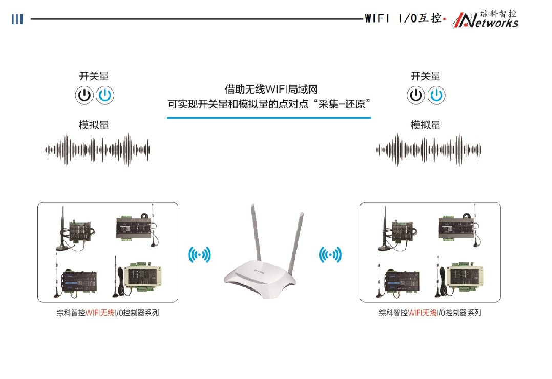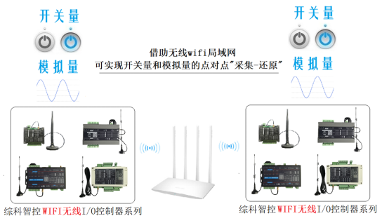 用于实现开关量或模拟量的1对1,也就是A模块采集开关量、模拟量然后通过有局域网无线wifi发送给B模块还原输出开关量、模拟量(或者反向传输),该模块无需客户做任何编程,只需要按我们操作指导对模块进行组网配对即可实现开关量模拟量的互传互控,代替有线传输,即插即用,即使普通电工按接线图完成接线亦可使用。