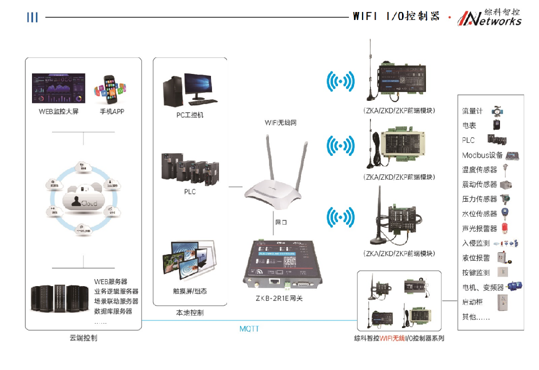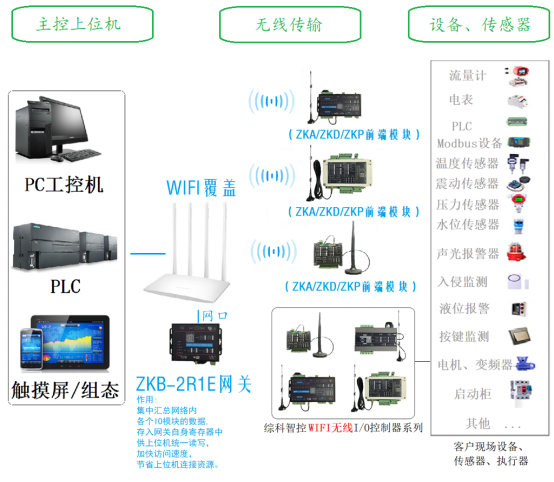 用户只需在使用区域内部署WIFI覆盖并规划各个模块的IP地址即可,上位机PC或PLC可通过局域网TCP/IP读写各个ZKD模块,也可以通过互联网云端对模块进行远程控制。