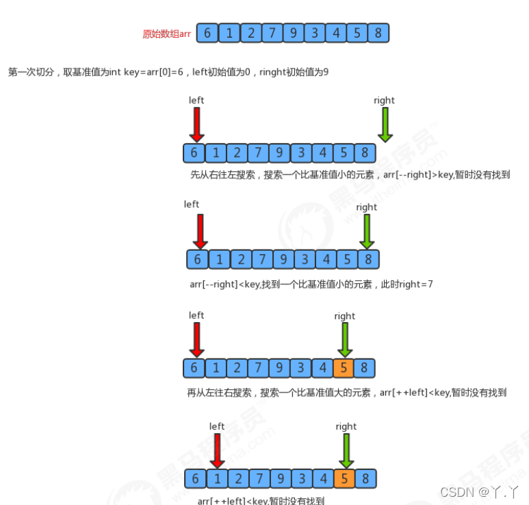 自己在开始看视频练习的时候,会很奇怪为什么代码就是在不停的分,之后的合并怎么办呢?但后面发现,虽然每一次是通过递归调用进行在分组,看似好像一次次在切块,但是本质上还是在对原有的数组上进行切分并进行调整排序,每次在变动的是数组中的索引在进行变动,好像是再切分的一样,然后再合并。但实质上其实还是在数组上,而不是像归并排序那样子,每次就切除然后直到不可以切除的时候,然后再对数组进行合并,此时才进行排序。而快排是在自己切分的时候就进行排序了,是一点点把排序大的范围,满满缩减,直到切分到不能再切,而这个时候左边的数肯定大于分界值,右边肯定小于等于分界值这个样子了。即然后分组排完序,有序了,然后加上分界值拼上就肯定也有序了