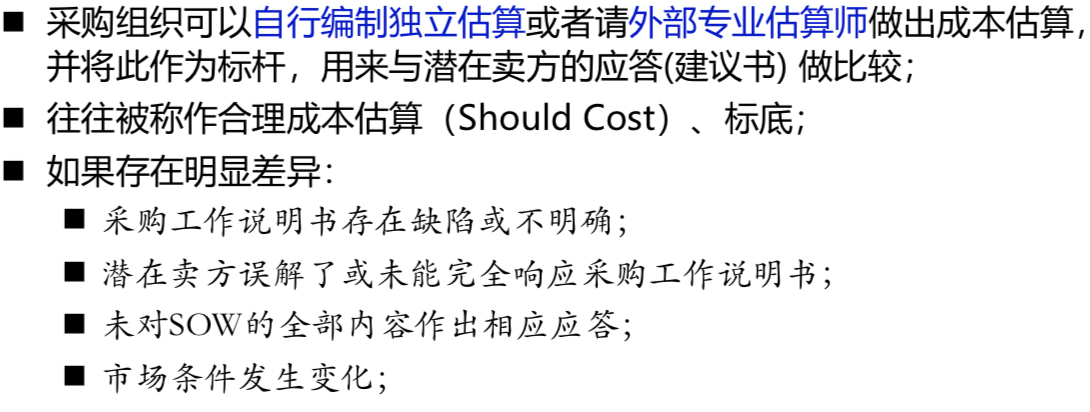 :对于大型的采购,采购组织可以自行准备独立估算,或聘用外部专业估算师做出成本估算,并将其作为评价卖方报价的对照基准。 -