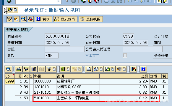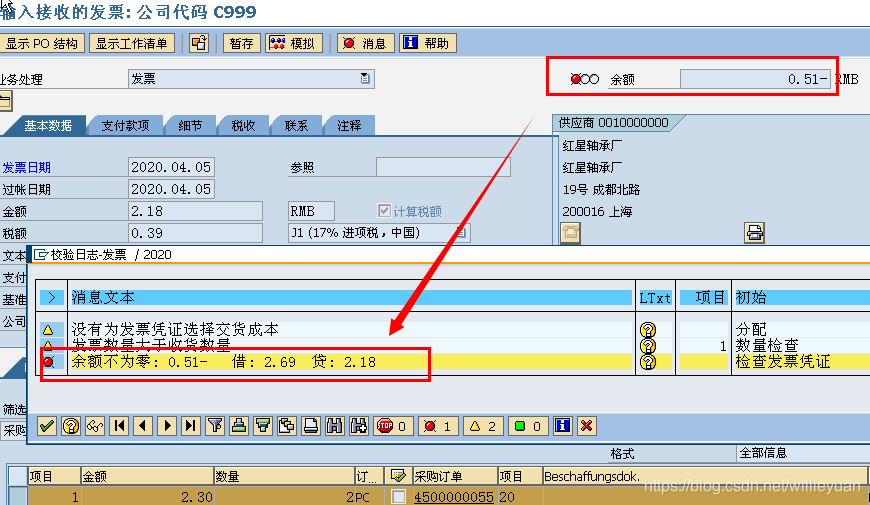 原本当公司层级的BD小差异配置为5RMB,当MIRO金额差异大于5RMB时会过账到“发票核减”中。但由于供应商容差中配置的小差额为4RMB,且5>4,则以供应商小差异4RMB为准。此时若MIRO金额差异大于4RMB,则会过账到“发票核减”中,小于4RMB会过账到DIF(价格差异)科目中。