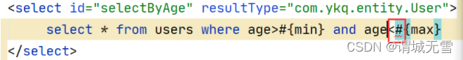 <![CDATA[select * from users where age>#{min} and age<#{max}]]>