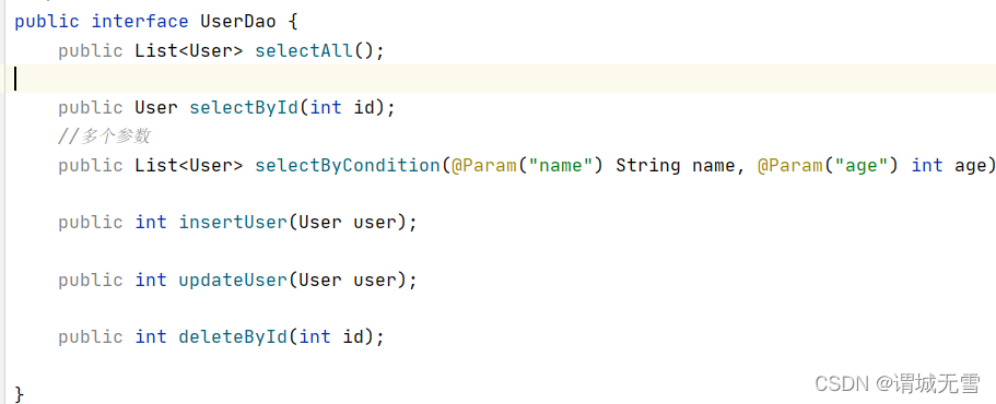 public List<User> selectByCondition(@Param("name") String name, @Param("age") int age);