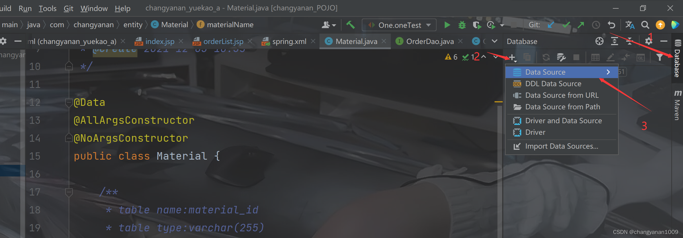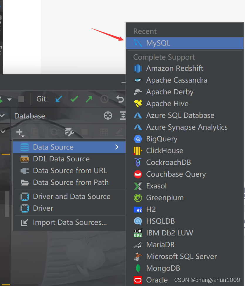 2.idea 右侧 1.点击Database 2.点击+号 3.选择Data Source