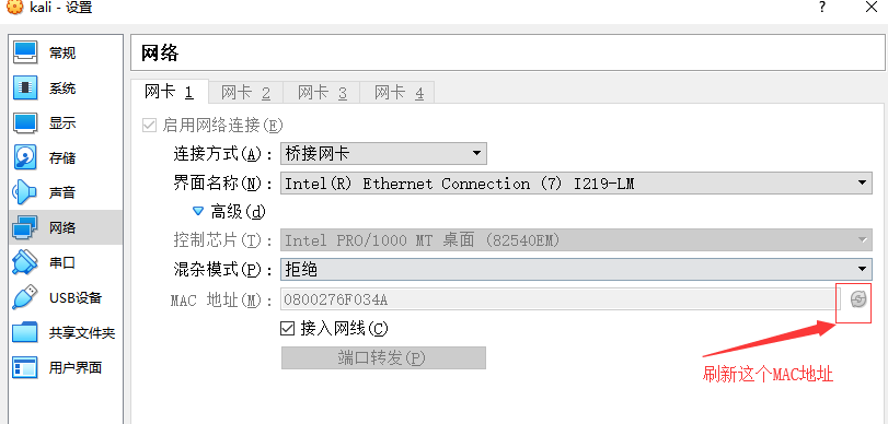 (2)如果(1)步都没问题,但是还是连接不上,试着ping一下,如果ping不通,需要刷新一下MAC地址,这一步是针对virtualbox的。如图1所示,同时将所有虚拟机的连接方式改成“桥接网卡”,具体说明见图2