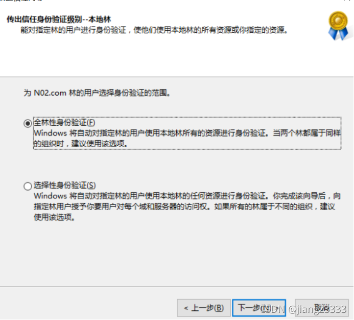 两个不同的林,林1的树根域域名为n01.com,林2的树根域域名为n02.com,要求n02.com里的用户可以访问n01.com域里的资源。PS:用林信任方式实现。