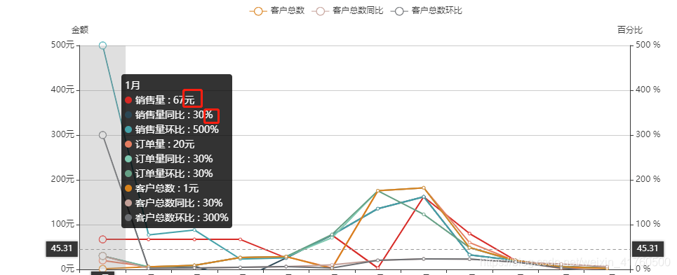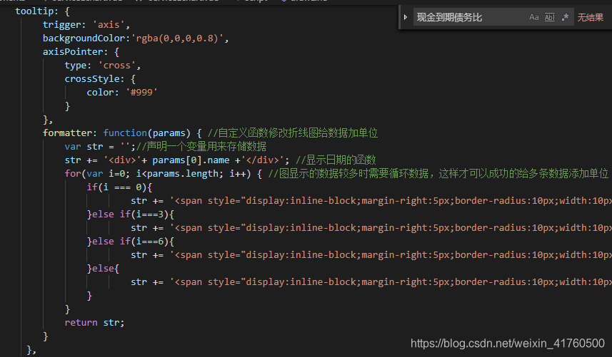 str += ‘<span style=”display:inline-block;margin-right:5px;border-radius:10px;width:10px;height:10px;background-color:’+params[i].color+’;”></span>’+ params[i].seriesName +'</span> : <span>’+ (params[i].data ? params[i].data+’元’ : ‘暂无’) +'</br>’;