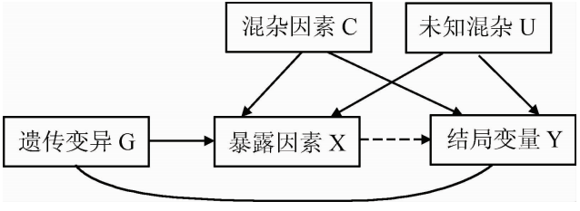 遗传变量G与暴露因素X有关联,如果观测到遗传变异与解决变量Y之间也存在关联,那么可以说明是遗传变异G通过暴露因素X对结局变量Y造成的影响,从而说明了暴露因素X和结局变量Y之间的因果性。