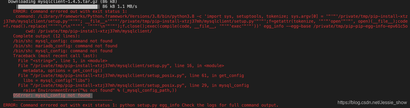 错误:在安装一个项目的requirement.txt时,mysqlclient安装失败,报错如下: