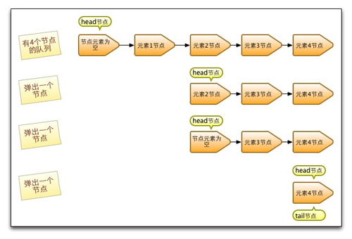 - 添加元素4:设置元素3的next节点为元素4节点;更新tail节点指向元素4节点。