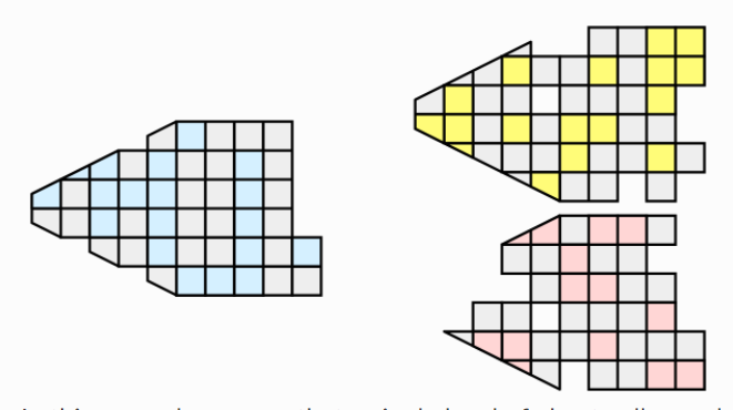 现在,让我们假设我们想要使用三个进程在这个网格上执行可视化。我们可以使用蓝色、黄色和粉色区域分割网格单元,如下所示。