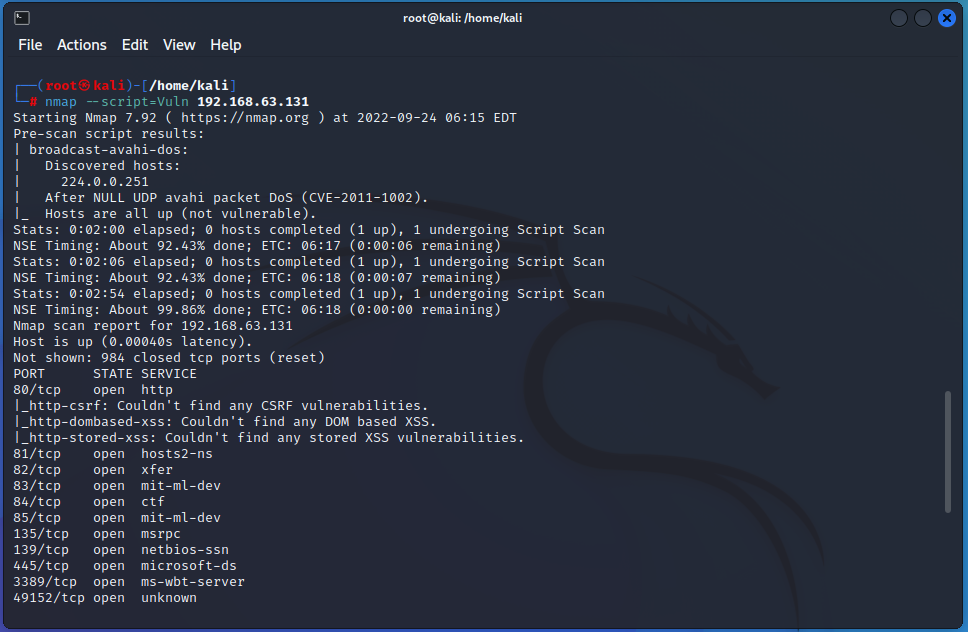 命令:nmap –script=Vuln 192.168.63.131(192.168.63.131为08r2的ip地址,即靶机的ip地址) 如下图: