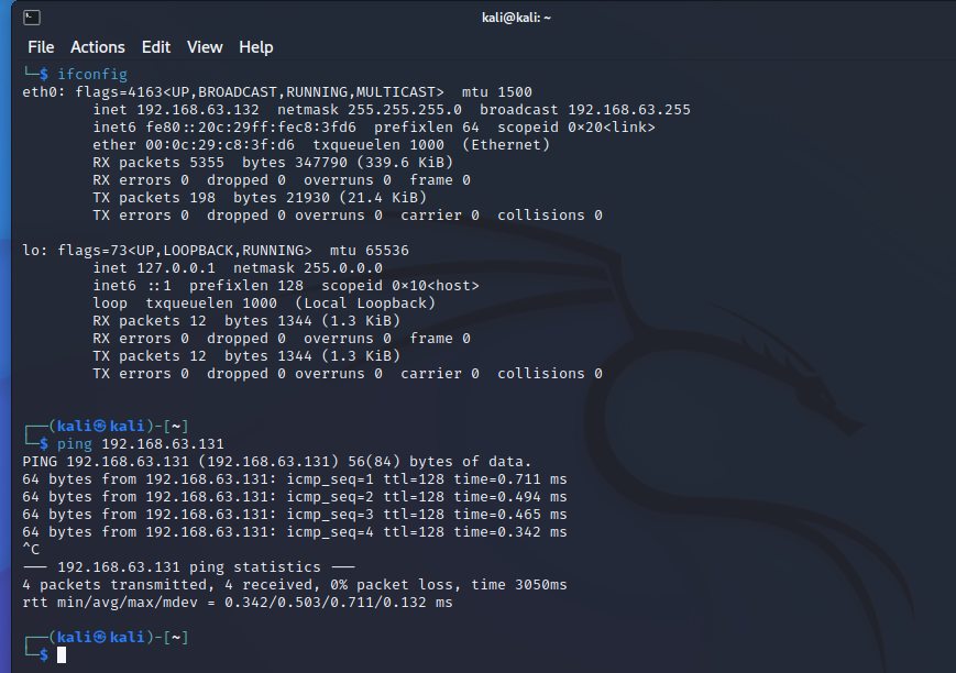 查看Kali的ip地址,192.168.63.132,并用ping测试其与08r2的网络连通性,如下图: