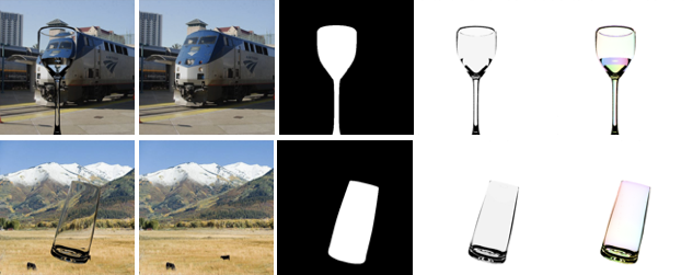 TOM-Net[3]将透明抠图问题视为折射流的估计问题,网络支持对单图输入,经过三分支的编解码器网络,分别预测图像的Object Mask,attenuative mask,flow mask(折射流图),并可以通过折射流信息进一步在新的背景进行合成。该方法的局限性在于其假设物体必须全部为无色透明物体,并且在训练过程中需要折射流图作为label, 而折射流图在真实世界是非常难以获取的,因此该方法的训练数只能依赖于图形学合成,与真实透明图像的分布无法一致(图像的语义合理性存疑,例如玻璃杯在山前悬浮)。经过我们在实际数据上的测试,该方法在实际图像的表现并不理想。