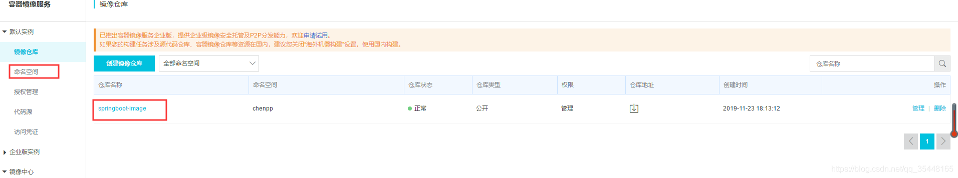 1.登录自己的阿里云,创建镜像仓库(注意namespace和密码)