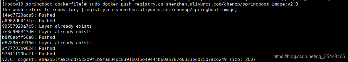 [root@10 springboot-dockerfile]# docker push registry.cn-shenzhen.aliyuncs.com/chenpp/springboot-image:v2.0