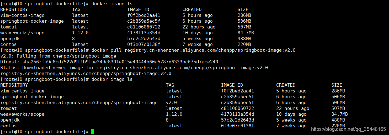 [root@10 springboot-dockerfile]#docker pull registry.cn-shenzhen.aliyuncs.com/chenpp/springboot-image:v2.0