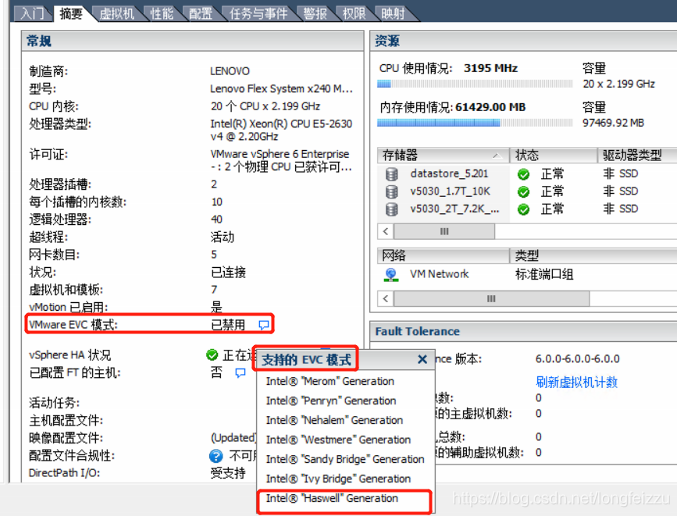登录vCenter在“清单”–“主机–摘要”可以看到,当前集群没有开启EVC模式,esxi主机支持的EVC模式最高级确实为Intel “Haswell” Generation。比该服务器CPU所支持的最高EVC模式Intel Broadwell Generation低一级,这是vCenter EVC基准的限制所致。