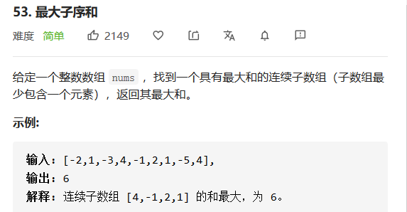 在力扣上做了一题求最大子序和,对象是一维数组,用的是动态规划思想,很简单在这就不赘述了,题目和代码如下: